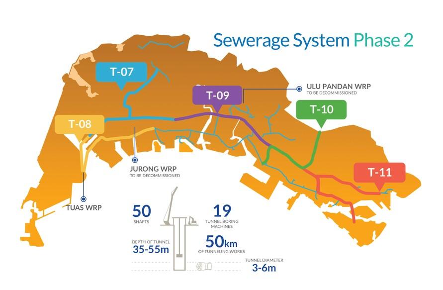 The second phase of the project (DTSS Phase II) involves the construction of around 50 kilometers of tunnels deep underground in the island state. Their task is to transport the wastewater produced in the south and west to the new Tuas Water Reclamation Plant. You can see the route of the tunnels in the diagram on the right.